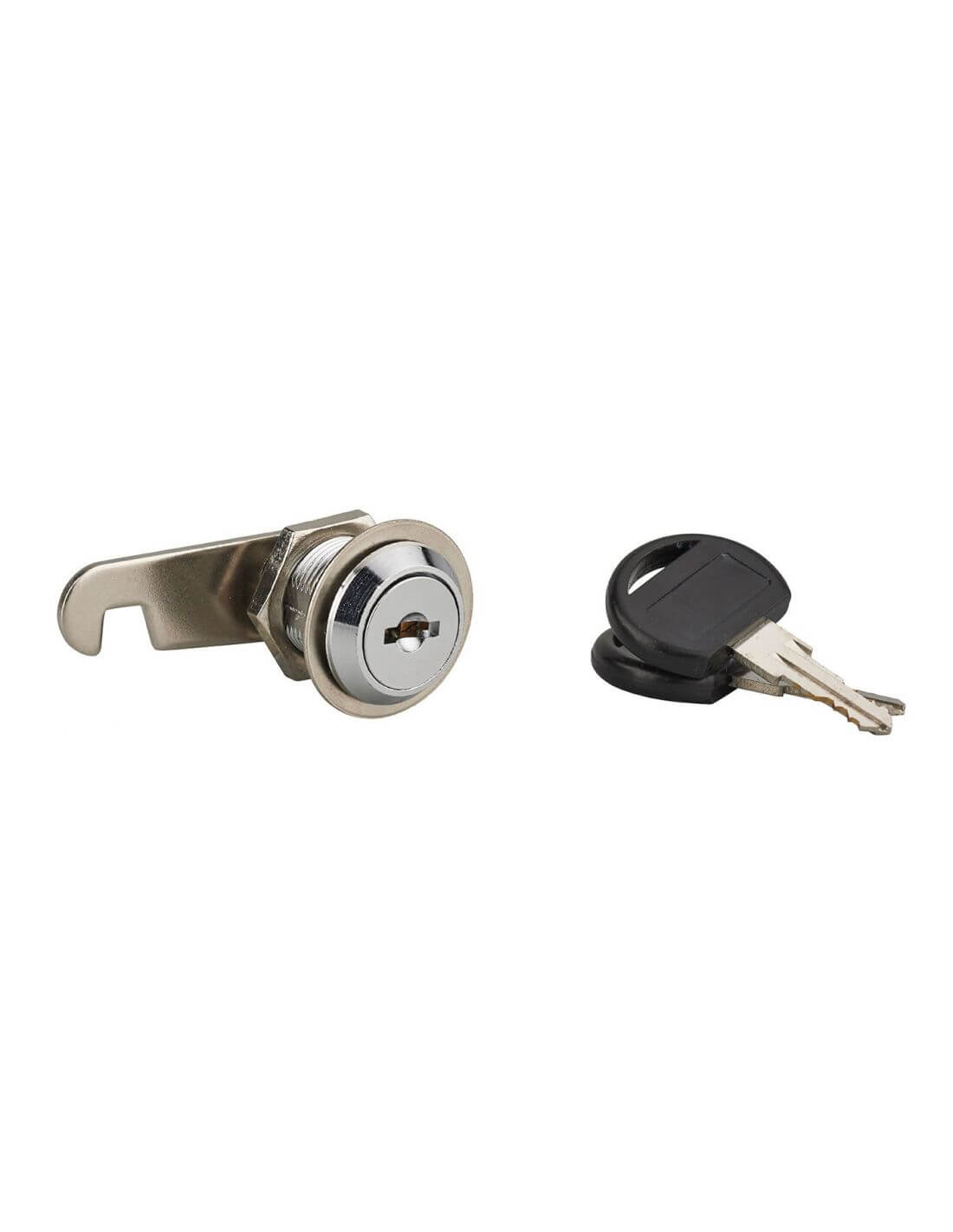 Corp din aliaj turnat. Mecanism cu discuri. Camă plată. 2 chei nichelate, cu protecție PVC. Piuliță și clemă pentru fixare. Finisaj nichelat.